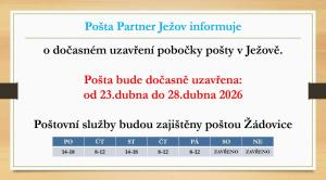 o dočasném uzavření pobočky pošty v Ježově. Pošta bude dočasně uzavřena: od 23.dubna do 28.dubna 2026 Poštovní služby budou zajištěny poštou Žádovice